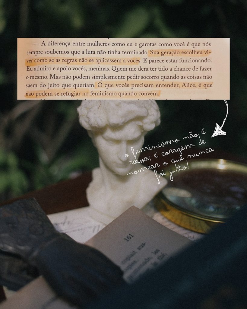 Essa frase sobre o feminismo nasceu bem desse incômodo mesmo, de não romantizar certas posturas só porque vêm de mulheres. Fico muito feliz que tenha te pegado também.