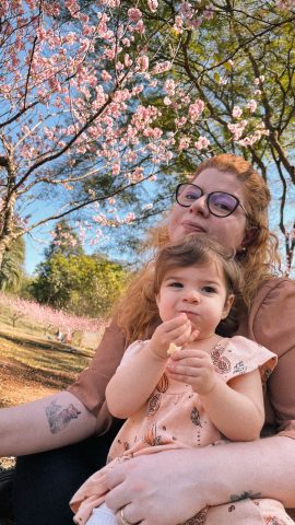 Falando em saúde, eu me abandonei um pouco. Não me cuidei como deveria. Sou hipertensa, fiquei sedentária, evitei espelhos. Tem coisas que ainda doem de escrever. A maternidade faz isso: a gente some um pouco de si mesma. E, ao mesmo tempo, eu estava inteira na criação da Cora. Vendo ela descobrir o mundo, viver suas primeiras vezes, olhar tudo com curiosidade. Eu sou o mundo dela agora.